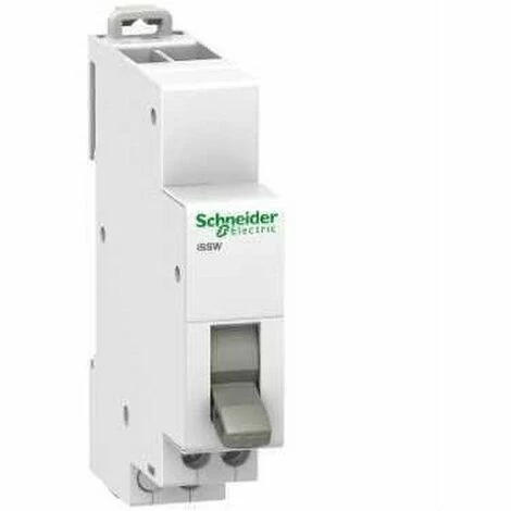 Acti 9-Elektrokreissteuerung, 1 Schließer, Öffner, 2-Positionen-Wechselschalter, 20 A, 250 V, 50/60 Hz, 2-Positionen-Griffsteuerung, verstellbare Clipbefestigung, DIN-Schienenhalterung, blankes 9-mm-Unterkabel, 82 x 18 x 75 mm und weiß gefärbt. Normen: IEC 60669-1, IEC 60947-5-1.