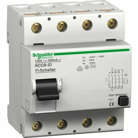 Fehlerstromschutzschalter Acti 9 iID, 1,5kA (IEC/EN 61008-1). 4-polig, Nennstrom 63A, Erdschlussempfindlichkeit 30mA, Erdschluss-Schutzklasse Typ A, Betriebsspannung (Ue) 400V AC, Isolationsspannung (Ui) 500V AC. Gewährleistet den Zusatzschutz bei direktem Berühren (= 30mA). Fehlerschutz bei indirektem Berühren, z.B. bei Isolationsfehlern (= 100mA, = 300mA). Fehlerschutz in Baustromverteilern (500mA). Schalten und Trennen von Stromkreisen. Sprungschaltung für verschleißarmes Schalten der Kontakte. Mit mechanischer frontseitiger Fehlermeldeanzeige (VisiTrip) zur Anzeige von Auslösungen durch Überlast oder Kurzschluss. Sichere Kontaktanzeige (VisiSafe) des Fehlerstromschutzschalters, bei grüner Anzeige Sicherheit der Spannungsfreiheit auf der Abgangsseite. Prüftaste für die regelmäßige Prüfung der Funktion. Doppel-Anschlussklemmen für beidseitigen Anschluss von Kabeln oder Phasenschienen. Einfache Entnahme des Einzelgerätes bei installierter Phasenschiene, dank des frontseitig erreichbaren Befestigungselementes. Zusätzlich anreihbare Hilfsmodule (optional)- Unterspannungsauslöser (iMN), Überspannungsauslöser (iMSU), Arbeitsstromauslöser (iMX), Hilfsschalter zur Statusmeldung (iOF), Fehlermeldeschalter (iSD). Werkzeuglose Montage linksseitig am Gerät. Farbton RAL 9003. Der Fehlerstromschutzschalter iID erfüllt folgende Normen- IEC/EN 61008-1 und IEC/EN 60947-2. Des Weiteren ist diese Baureihe VDE zertifiziert!.
