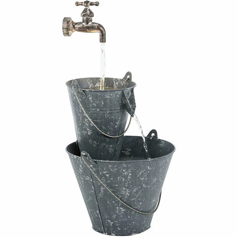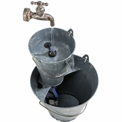 Außergewöhnlicher Brunnen, bei dem das Wasser aus dem Wasserhahn durch das Plasikrohr zunächst in den oberen Einer fließt. Von dort aus wird es über einen Ausguss in den unteren Eimer befördert.