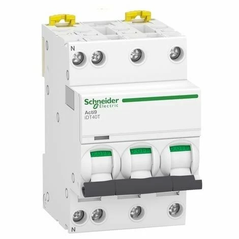 Modularer Leistungsschalter iDT40T 3P+N 25A Kurve C von Schneider Electric, Acti9-Reihe. Für Steuerungs- und Schaltungsüberstromschutz. Magnetischer Auslöser.